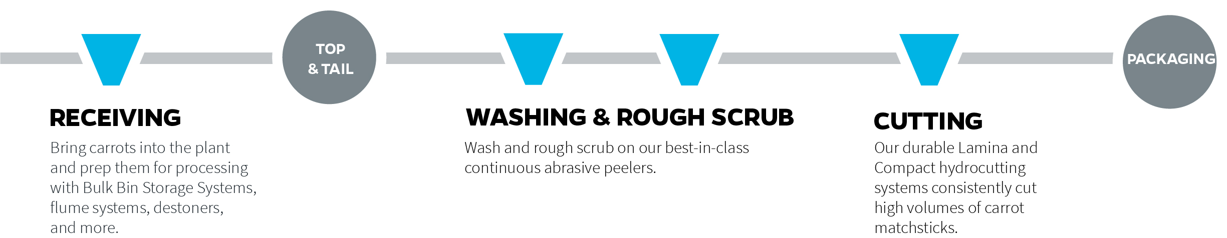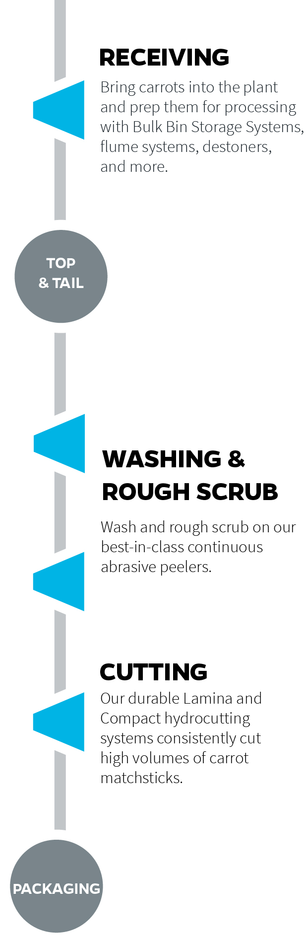 Vanmark carrot processing equipment supports large-scale operations. Our machines integrate seamlessly with other OEMs to automate processing lines for baby carrots, carrot matchsticks, and more. We custom-configure each line to your plant, production volume, equipment layout, and product mix. See how our equipment fits within the general carrot processing process.